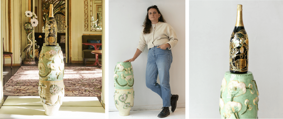 Je suis fière d’avoir participé à la conception de l’expérience visuelle La parenthèse Belle Époque, initiée par l’agence créative Canon, à la suite d’un appel d’offres que nous avons remporté. J’ai eu l’opportunité de créer toute l’identité visuelle du lieu et de collaborer avec des profils créatifs incroyables, comme Mushroom Studio, chineuse professionnelle, et Marion Livran, qui a réalisé de magnifiques peintures sur miroir. J’ai également conçu une stèle en bas-relief pour mettre en valeur le jéroboam de champagne Perrier-Jouët. Cette expérience m’a permis d’exprimer pleinement mon profil pluridisciplinaire et de repousser mes limites créatives, en mobilisant à la fois mes compétences de directrice artistique et de céramiste. Ma stèle a même été intégrée à la collection permanente de la marque.