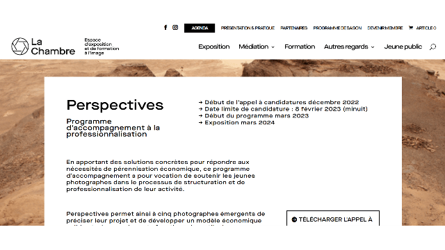 Perspectives permet ainsi à cinq photographes émergents de préciser leur projet et de développer un modèle économique solide et pérenne. Aspects fonctionnels, outils de valorisation, diffusion, développement d’un réseau professionnel… les différentes caractéristiques de l’activité sont abordées grâce à l’intervention de professionnel·les reconnu·es du secteur.