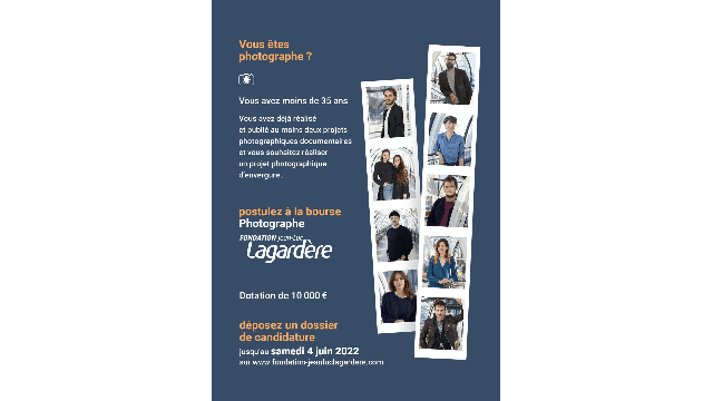 En 2023, l’appel à candidatures pour la bourse Photographe de la Fondation Jean-Luc Lagardère est ouvert jusqu’au 7 juin. Cette bourse est attribuée à un.e jeune photographe professionnel.le désireux.se d’effectuer en France ou à l’étranger, une production photographique à caractère documentaire, dans le domaine social, économique, politique ou culturel.Elle permet au/à la lauréat.e de réaliser son projet photographique, grâce à une dotation de 10000 €.Candidature et règlement > cliquez ici