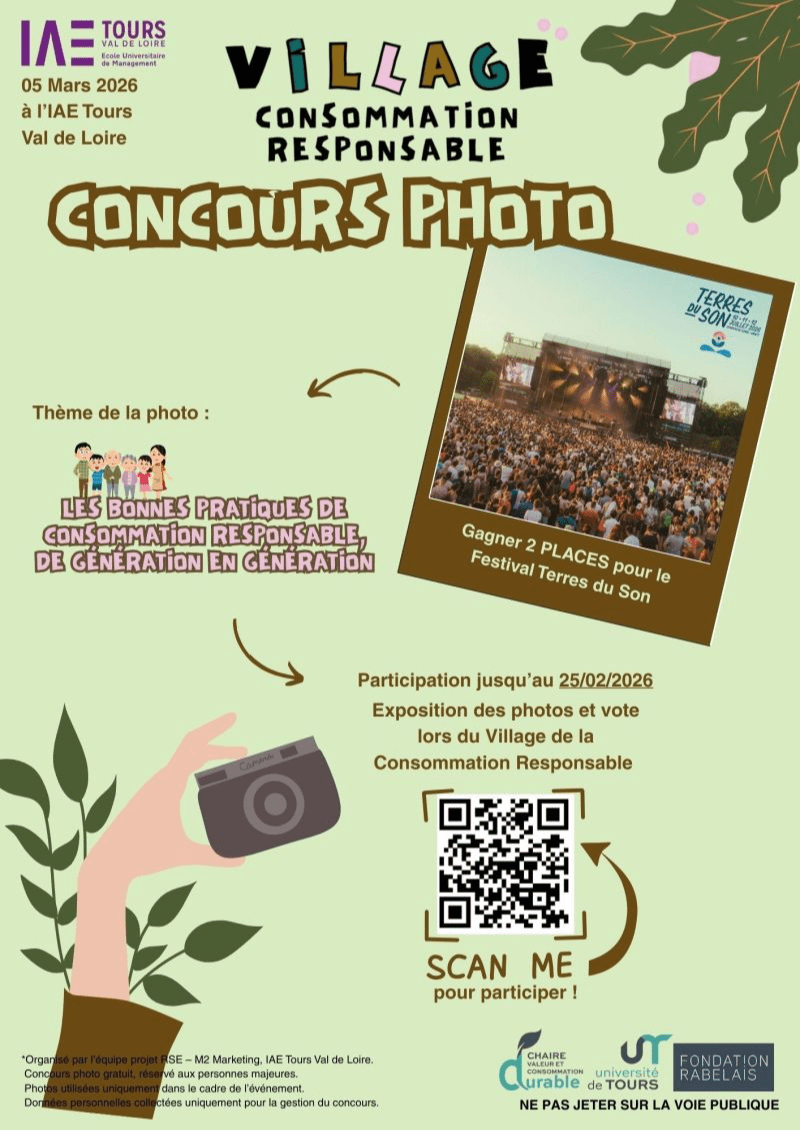Dans le cadre du programme de la chaire « Valeur et consommation durable », les étudiants du projet RSE en Master 2 Marketing stratégique et digital de l’IAE Tours Val de Loire organisent le « Village de la consommation responsable » le jeudi 5 mars à l’IAE.