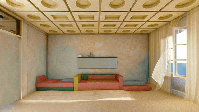 Au premier étage de l’ancien Évêché, une salle baignée de lumière, une musique apaisante, et une senteur enveloppante créent une atmosphère unique. Des assises géométriques, aux couleurs patinées par les rayons UV, et des empreintes de pas laissées dans le sable au sol symbolisent le temps écoulé. Sébastien Gafari et Sara Guédès ont imaginé un palazzo déchu réinvesti par des voyageurs de passage.
