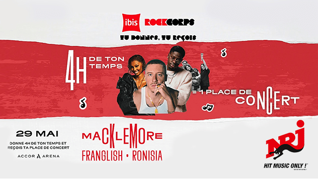 L'engagement est simple : en échange de 4h de bénévolat sur un projet Ibis RockCorps*, chaque volontaire reçoit une place pour un concert exclusif Ibis RockCorps, organisé dans l'emblématique Accor Arena le 29 mai.