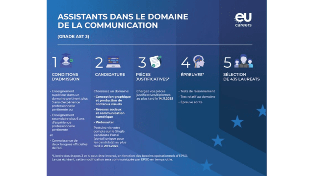 Ce concours européen est une procédure de sélection en ligne et gratuites organisées par EPSO (l’Office européen de sélection du personnel). Être lauréat permet d’accéder à une carrière de fonctionnaire au sein des institutions de l’Union européenne, avec des missions de haut niveau, une forte dimension internationale et une rémunération compétitive. 159 lauréats sont attendus sur cette session : vous avez donc toutes vos chances !