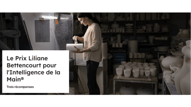 Créé en 1999, le Prix Liliane Bettencourt pour l’Intelligence de la Main® récompense savoir-faire, créativité et innovation dans le domaine des métiers d’art. Il comprend trois récompenses : Talents d’exception, Dialogues et Parcours. En savoir plus sur le prixRèglement - Talents d'exception 2026(PDF - 2.3 Mo)Règlement - Dialogues 2026(PDF - 2.4 Mo)FAQ - Prix Liliane Bettencourt pour l'Intelligence de la Main 2026(PDF - 1.2 Mo)CalendrierOuverture de l'appel à candidatures édition 202612 novembre 2025Clôture de l'appel à candidatures édition 202616 mars 2026Désignation des lauréatsAutomne 2026Présentation de la récompenseCette récompense salue une personne morale, pour son engagement et sa contribution exemplaire au secteur des métiers d’art français.Dotation : 50 000€Accompagnement : jusqu’à 100 000€ pour un projet destiné à faire rayonner l’univers des métiers d’artToutes les infos sont à retrouver ici