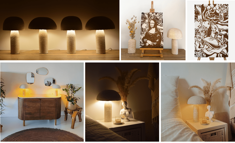 J'ai présenté mon projet de création d'entreprise MYCODesign, qui se concentre sur la fabrication d'objets décoratifs en mycélium, une matière naturelle et biodégradable, étant la racine des champignons. À ce jour, je propose une gamme de luminaires et de tableaux décoratifs.
