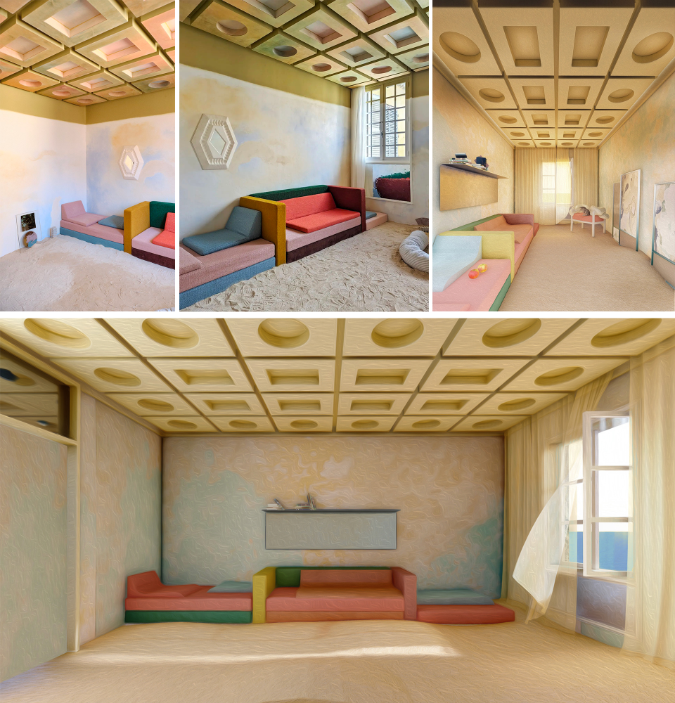 Au premier étage de l’ancien Évêché, une salle baignée de lumière, une musique apaisante, et une senteur enveloppante créent une atmosphère unique. Des assises géométriques, aux couleurs patinées par les rayons UV, et des empreintes de pas laissées dans le sable au sol symbolisent le temps écoulé. Sébastien Gafari et Sara Guédès ont imaginé un palazzo déchu réinvesti par des voyageurs de passage.