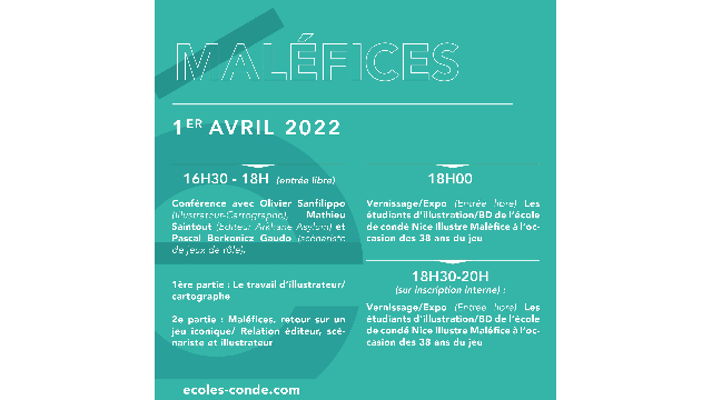 Partenariat jeu de rôle Maléfices - EvènementNos jeunes illustrateurs en 2ème année de bachelor, ont fait une proposition à l'éditeur, à l'occasion des 38 ans du jeu de rôle Maléfices. De ce fait, nous organisons un événement sur notre campus, ce vendredi 1er avril ! Et vous êtes bien sûr conviés ! 😍 Voici le déroulé : ➡ 16h30 : conférence avec Olivier Sanfilippo (Illustrateur-Cartographe), Mathieu Saintout (Editeur Arkhane Asylum) et Pascal Berkonicz Gaudo (scénariste de jeux de rôle). Cette conférence présentera le travail d'illustrateur/cartographe et présentera également le jeu et la relation entre les 3 différents métiers des animateurs. ➡ 18h00 : Vernissage de l'exposition du travail de nos étudiants, à l'occasion des 38 ans du jeu. ➡ 18h30 : tables de jeux, réservées à nos étudiants actuels. On espère vous voir très nombreux !!📍 Ecole de condé Nice : 4 Rue Biscarra, Nice.